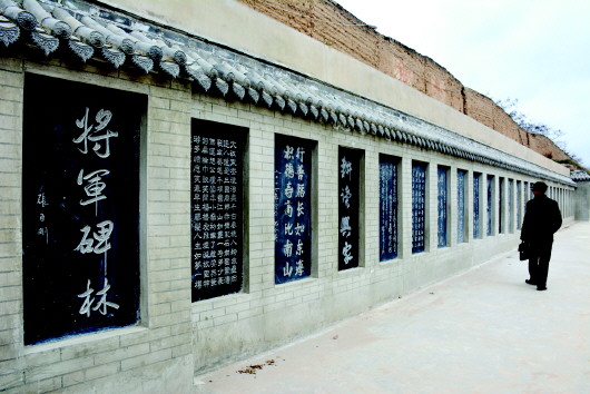 中岔古堡一堡三院,分為前院、中院、后院。走進(jìn)古堡,堡門左側(cè)建有戲樓,上書“中岔劇場”四字。戲樓(又稱戲臺)始建于清光緒年間,上世紀(jì)六七十年代曾重修過。近堡門處右側(cè)堡墻下修建有兩處一體化的石碑長廊一直通向后院,碑廊中石碑一塊接著一塊砌筑在青磚墻內(nèi),石碑與石碑之間以青磚分隔,上覆筒瓦和滴水防護(hù),每一通石碑上都刻有中華人民共和國將軍書寫的一幅書法作品。第一通石碑上甘谷籍將軍張臣剛書寫的“將軍碑林”四字分外醒目,劉精松、邢世忠、裴懷亮、李乾元等數(shù)十位叱咤風(fēng)云的共和國將軍書寫的書法碑刻依次嵌進(jìn)墻內(nèi),組成一個(gè)氣勢磅礴、雄偉壯觀的將軍書法長廊,這就是新建的將軍碑林。