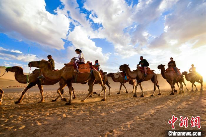 圖為游客騎駱駝暢游鳴沙山?!⊥醣筱y 攝