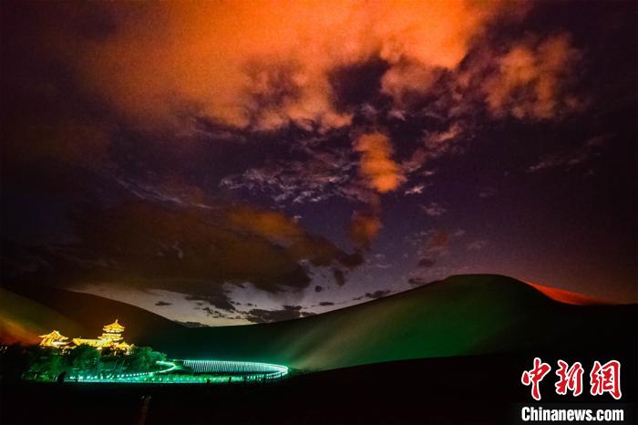 圖為游客觀賞月牙泉晚霞美景。 王斌銀 攝
