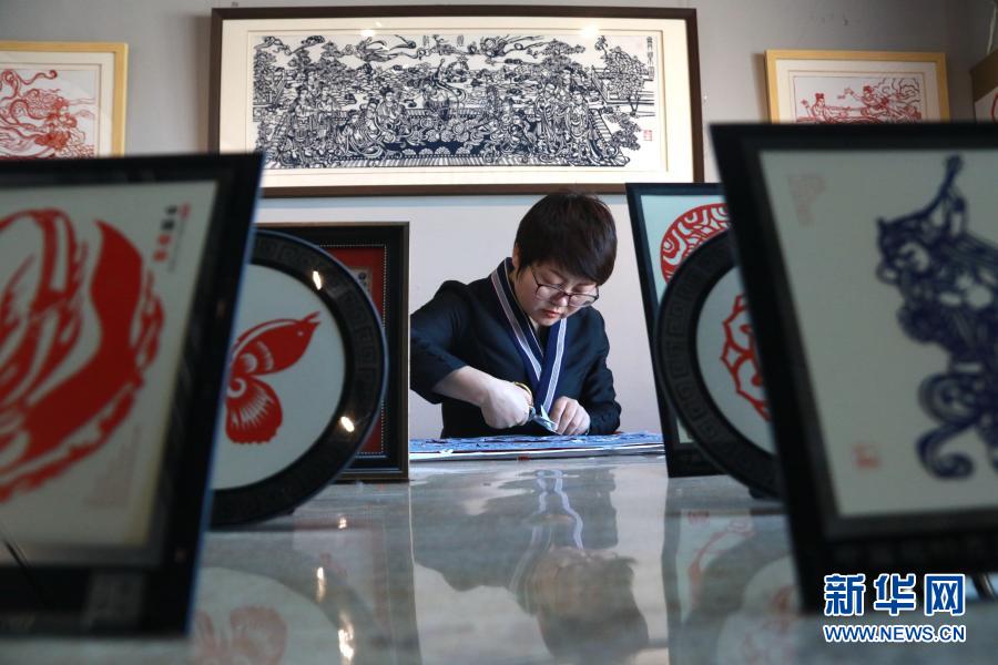 在甘肅敦煌小鎮(zhèn)鳴沙書院,“敦煌剪紙”酒泉市級非物質(zhì)文化遺產(chǎn)代表性傳承人莊生娟在自己的工作室內(nèi)創(chuàng)作(2020年12月31日攝)。新華社發(fā)(張曉亮 攝)