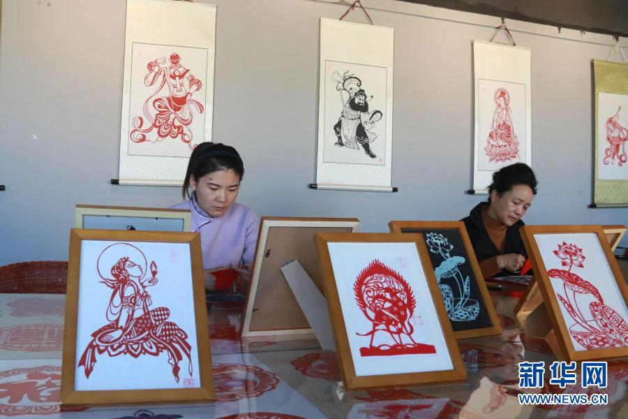 在甘肅敦煌小鎮(zhèn)鳴沙書院,“敦煌剪紙”酒泉市級非物質(zhì)文化遺產(chǎn)代表性傳承人莊生娟(左)在自己的工作室內(nèi)指導(dǎo)學(xué)員剪紙(2020年12月31日攝)。新華社發(fā)(張曉亮 攝)