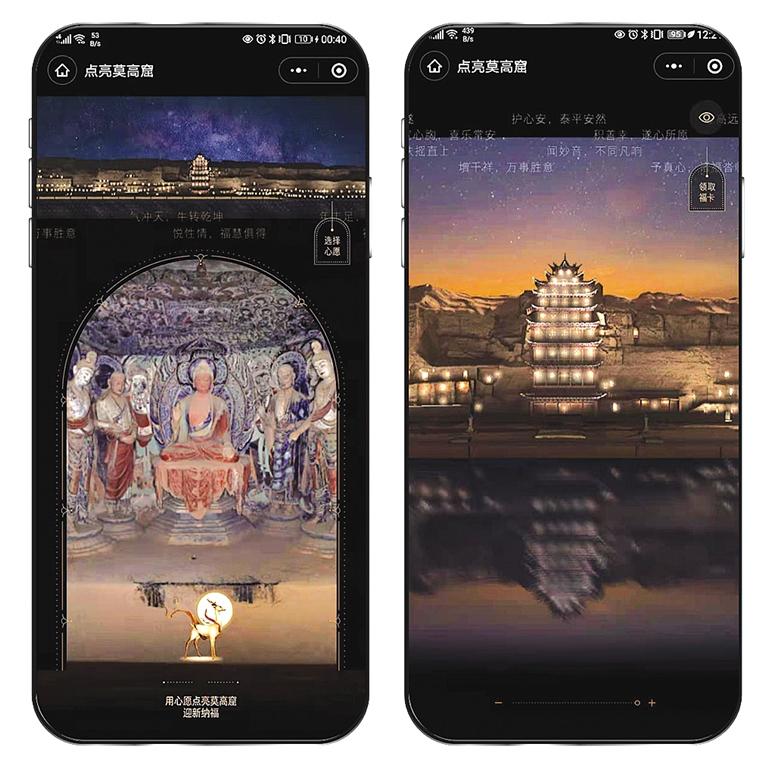 為了感受千年前莫高窟的燃燈民俗,記者迫不及待地體驗(yàn)了一把:進(jìn)入“云游敦煌”官方小程序,通過(guò)“點(diǎn)亮莫高窟”入口,即可欣賞星空下的莫高窟全景,并與萬(wàn)千用戶(hù)一起“點(diǎn)亮”崖體上的洞窟。隨著用戶(hù)點(diǎn)亮人次增多,畫(huà)面中燈光的亮度也隨之增加。至深夜時(shí)分,用戶(hù)將會(huì)看到莫高窟崖體上空“銀河”與洞窟光亮相映成輝的景象,體驗(yàn)千年前莫高窟燃燈盛況。“點(diǎn)亮莫高窟”的創(chuàng)意來(lái)自于敦煌文獻(xiàn)中記載的場(chǎng)景,莫高窟燃燈是敦煌歲時(shí)民俗。據(jù)記載,每逢特定的時(shí)間,當(dāng)?shù)孛癖姇?huì)在莫高窟舉行盛大的燃燈活動(dòng),于窟龕點(diǎn)亮燈盞。總燈數(shù)可高達(dá)700余盞。