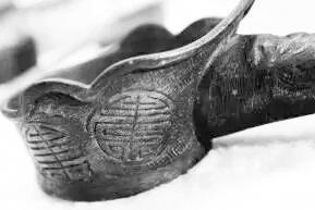 讓我們先看看這個熨斗:這是一件漢代家庭使用的生活工具,從外形來看,它通長28厘米,柄長16厘米,勺徑12厘米。柄、勺分別鑄造后焊接而成,勺圓口,寬折沿,微侈,圓腹,圓底,外沿下一圈弦邊。沿下焊柄,柄呈平面,圓底條狀,柄首呈張口龍頭形,勺內(nèi)有黑色炭跡。這是兩千年前漢代人使用時留下來的痕跡。在勺的外側(cè),還有一塊類似銘文的東西。
