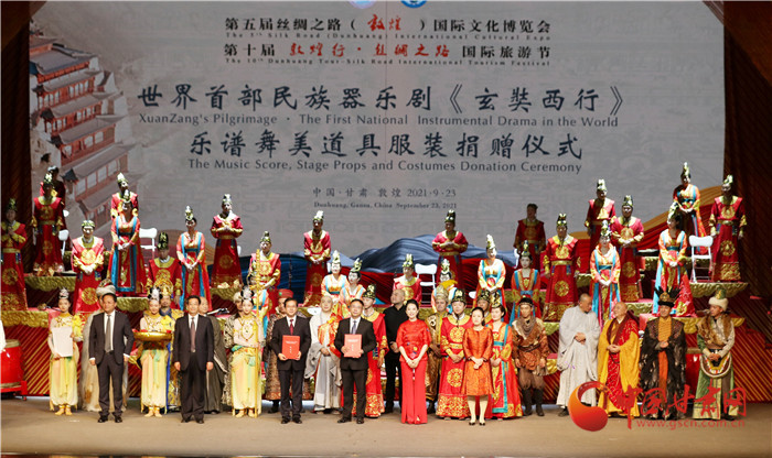 演出結束后,現(xiàn)場舉行了簡潔而隆重的“大型民族器樂劇《玄奘西行》樂譜舞美道具服裝捐贈儀式”,中央民族樂團將價值360萬元的樂譜、舞美、道具和服裝捐贈給甘肅演藝集團歌舞劇院,并指導甘肅省文藝院團將民族器樂劇《玄奘西行》打造成為弘揚絲路精神、推動絲路文化交流融合的經(jīng)典劇目。中央民族樂團作為海內外規(guī)模最大、藝術最完備的綜合性國家級民族音樂表演團體,對甘肅文藝事業(yè)和地方樂團創(chuàng)作發(fā)展和人才培養(yǎng)給予大力支持,為甘肅文藝事業(yè)發(fā)展做出了重大貢獻。