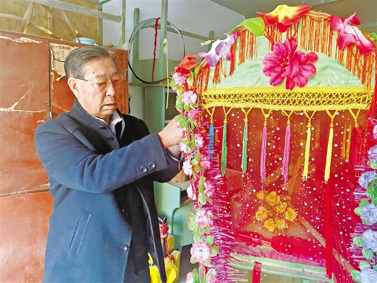 除了編排社火曲目,閆文發(fā)還親手制作道具。“有的道具貴,或者買不上,我就自己琢磨、自己做。”花轎、旱船、白龍馬……做得惟妙惟肖。“我們的曲目需要啥道具,閆老師都能做,手特別巧,給社火隊節(jié)約了不少成本。”隊友張吉榮對閆文發(fā)的手藝贊不絕口。