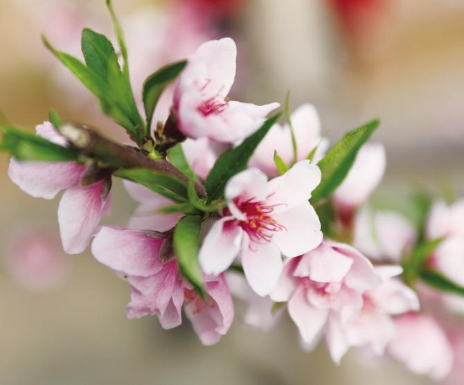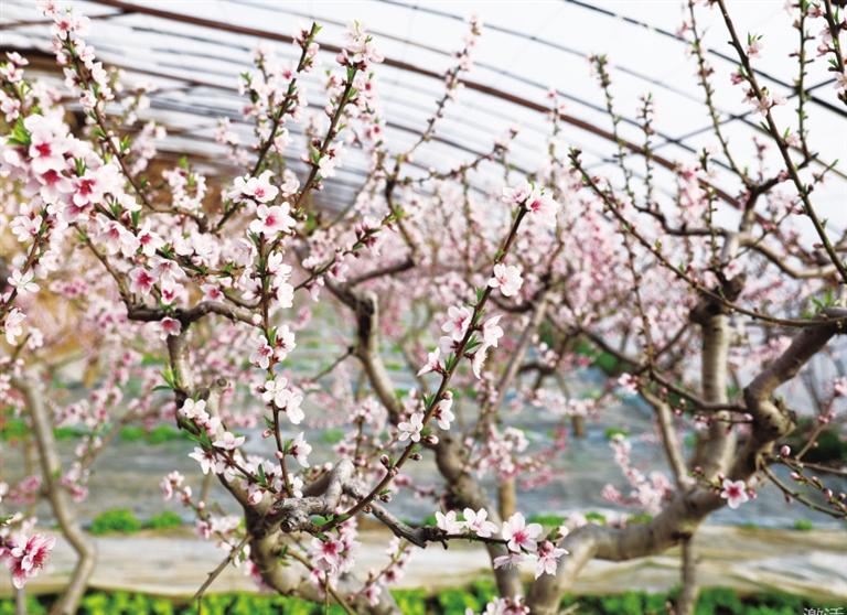 掀起兩層厚重簾子,哇!一片桃花正艷,真是“桃之夭夭灼灼其華”的美景。棚外一片寒冬生命蕭條,沉寂寧靜之靜景,棚內(nèi)卻成仲春生命伸展,嫩葉初展,鮮花綻放的動態(tài)。油桃樹最高1.8米,大小相間,形狀各異,枝丫被種植者剪成錯落有致,折回分叉,不重疊、透光好的唯美造型。一根根長短各異的枝條,綴滿了嬌艷的要么正在綻放粉紅色花朵,要么含苞欲放的花蕾。尤其花間那一簇簇一寸來長的滴翠綠初葉,更是令人欣慰十足!你要是凝視一棵樹上的某一枝,你就會被粉紅的笑臉慢慢陶醉,陶醉其鮮嫩從外到內(nèi)紅色由淡到濃的神奇五瓣,其色彩變化,均是自然造就的神來之筆,每一個花瓣一如少女翹起的小嘴唇,是那樣的調(diào)皮,如此的逗人!她們聚在一起,訴說著那些生命的奧秘!那一簇簇燃燒正紅的花蕊之針,各自頂著一顆顆金黃的珠寶,又在蘊含著生命怎樣的走向?……