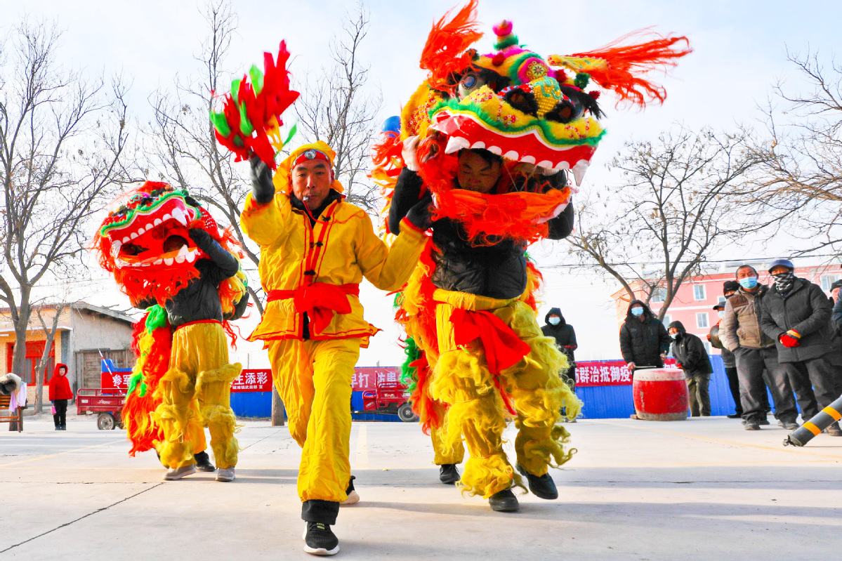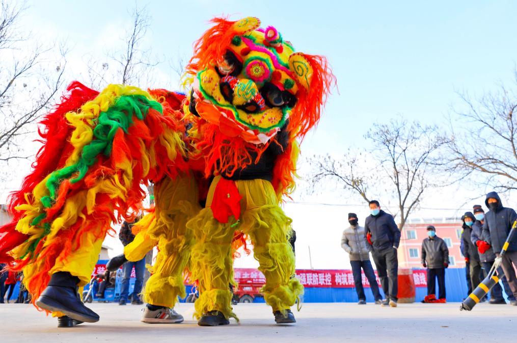 1月26日,甘肅省張掖市甘州區(qū)堿灘鎮(zhèn)草湖村文化廣場(chǎng)上,村文化隊(duì)為鄉(xiāng)親們表演了獅頭擺,追繡球,飆起來,威掃天下知的獅舞,迎接即將到來的新春佳節(jié)。