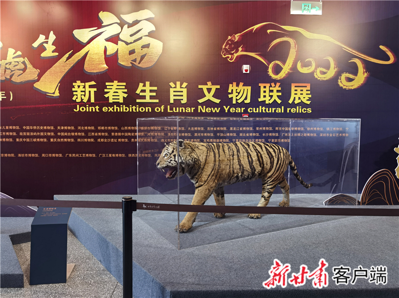 同時,還展出了甘肅省博物館甄選的全省20余件具有代表性的虎元素文物及自然標(biāo)本。這些展品中,最亮眼的當(dāng)屬甘肅省博物館館藏的一具野生東北虎標(biāo)本——體型較大、花紋斑斕、毛色光潔。