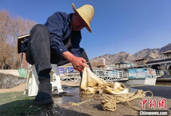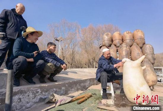 2月24日,春日暖陽(yáng)下,今年70多歲的省級(jí)羊皮筏子非遺傳承人張德寶在蘭州黃河邊制作羊皮筏子,為迎接旅游旺季到來提前做好準(zhǔn)備。劉玉桃 攝