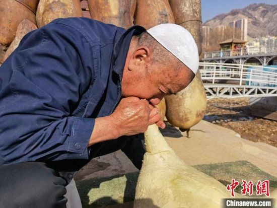 張德寶將處理好的羊皮扎好,留下一個(gè)口,往里面吹氣,使其鼓起來,最后捆扎在木架上完成。張德寶介紹說,1個(gè)羊皮囊他最快可以用30秒吹好,用嘴吹氣,其溫度和濕度更適宜羊皮筏子保存,如果使用過程中漏氣了,也需靠人吹補(bǔ)氣。(記者 劉玉桃)
