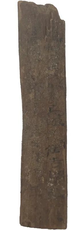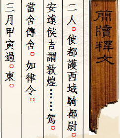 木簡1枚(出土編號:Ⅱ90DXT0213③:135),1990年出土于敦煌懸泉置遺址。長7.2、寬1.3、厚0.25厘米。木簡上殘,兩行書寫,字跡模糊,難以辨識。簡文作“二人。使都護西域騎都尉、安遠侯吉謂敦煌……駕,當(dāng)舍傳舍,如律令。三月甲寅過,東。”。簡中“使都護西域騎都尉”是西域都護的正式官名,“騎都尉”當(dāng)指以本官都護西域,是其本職,而“使”則突出了使職性質(zhì)。這是懸泉置記錄的一份傳文書,簡文不完整,大意是說某年三月甲寅日,西域都護鄭吉派遣的使者自西向東行,懸泉置依傳律規(guī)定,為停駐的兩名使者提供了飲食。該簡文對研究懸泉置的傳舍制度,以及西漢王朝對西域行使管轄提供了重要的原始資料?,F(xiàn)藏甘肅簡牘博物館。