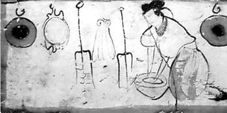糧食、蔬菜品種與前代相比沒有大的變化,仍是漢地人的主要經(jīng)濟和衣食來源。烹飪方法,這一時期出現(xiàn)了面粉發(fā)酵技術(shù)。北魏賈思勰介紹發(fā)面技術(shù)說:“面一石,白米七八升作粥,以白酒六七升酵中,著火上,酒魚眼沸,絞去滓,以和面,面起可作”(《齊民要術(shù)》卷9)。把北魏時期的容量數(shù)換算成今天的市斤,上段話的意思就是,用五十多斤面粉,五六斤白米做粥,再用四五斤白酒(甜米酒)做酵母,將酒架火上燒至發(fā)出魚眼樣的小泡后,濾去酒渣,加入面粥中發(fā)酵,等面發(fā)起后就可以做餅了。這是一項歷史性的烹飪技術(shù)。從發(fā)面的數(shù)量看,一次發(fā)這樣多面的家庭,至少有三五十口人,顯然是當(dāng)時世家大族的人口規(guī)模。世族如此,普通民眾也應(yīng)很快就學(xué)習(xí)掌握了發(fā)面技術(shù)。