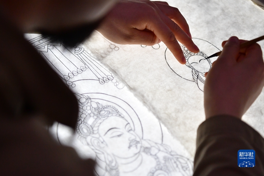 4月19日,在莫高窟第172窟,劉小同在對比臨摹壁畫的細節(jié)。新華社記者 杜哲宇 攝