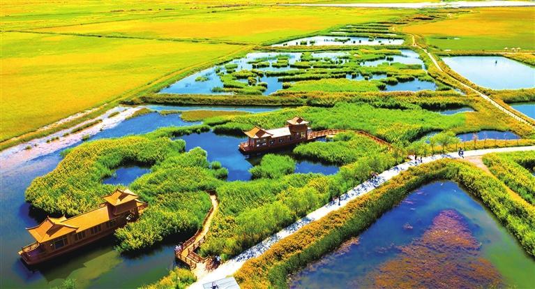 酒泉六分濕地景區(qū)是西北干旱荒漠區(qū)彌足珍貴的自然資源,也是重要的候鳥遷徙通道和停歇地。景區(qū)內(nèi)草長(zhǎng)鶯飛,綠樹成蔭,蘆葦、香蒲連綿不絕,濕地坑塘星羅棋布,觀光棧道、亭臺(tái)樓閣便于賞景,春來踏青夏避暑,秋來賞景冬納雪,吸引了不少游客前來打卡。