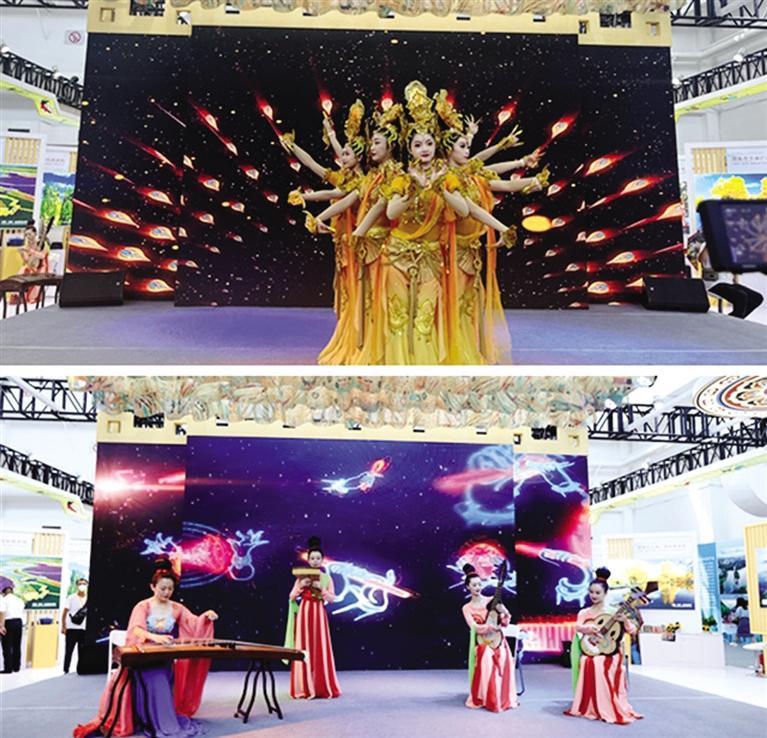 甘肅展區(qū)舞臺(tái)上,身著古裝的演員們生動(dòng)演繹著《千佛》《散花飛天》《反彈琵琶長(zhǎng)綢舞》等極具甘肅特色的敦煌古樂(lè)和敦煌舞蹈,令游人流連忘返。