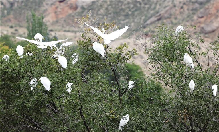 中國(guó)甘肅網(wǎng)10月14日訊 據(jù)蘭州日?qǐng)?bào)報(bào)道 金秋十月,蘭州新區(qū)秦王川國(guó)家濕地公園秋意漸濃。近日,隨著近百只白鷺的光臨,秦王川國(guó)家濕地公園再次迎來了候鳥遷徙的高峰期,成群的白鷺憩息在樹枝,繪就了一幅亮麗的秋景圖。