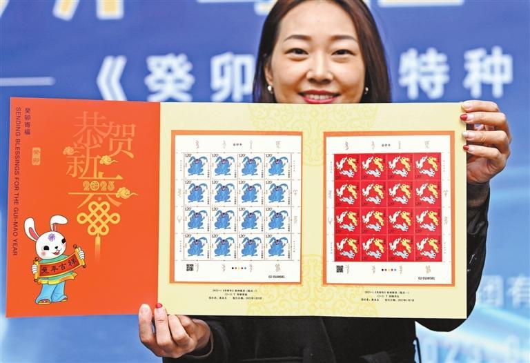 中國(guó)甘肅網(wǎng)1月6日訊 據(jù)蘭州晨報(bào)報(bào)道(奔流新聞·蘭州晨報(bào)記者王思璇)1月5日,中國(guó)郵政發(fā)行《癸卯年》特種郵票1套2枚,圖案內(nèi)容分別為:癸卯寄福、同圓共生,這套特種票是中國(guó)生肖郵票第四輪中的第八套。同日,《癸卯年》特種郵票在蘭州市各集郵營(yíng)業(yè)網(wǎng)點(diǎn)發(fā)售。