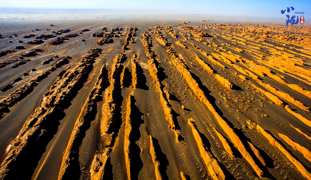 一隊隊整齊排列的雅丹像是整裝待發(fā)、氣勢磅礴的遠航艦隊,在浩瀚無垠的漠海上劈波斬浪,蔚為壯觀,實屬罕見。