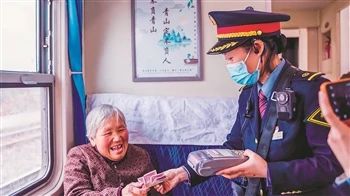 7505/7506次列車長在途中為老年旅客辦理現(xiàn)金補(bǔ)票業(yè)務(wù)。強(qiáng) 科 攝