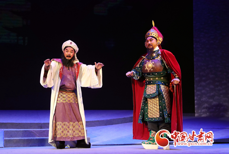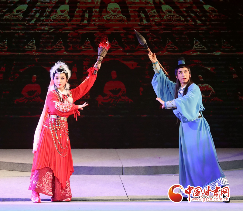 隴劇《敦煌》以回鶻族公主格麗莎的命運(yùn)軌跡為結(jié)構(gòu)框架和發(fā)展脈絡(luò),描繪了一幅炎黃子孫在血與火的洗禮中,保護(hù)中華民族文化的宏偉畫(huà)卷,充分詮釋了敦煌文化“美人之美”“美美與共”的開(kāi)放胸襟,“止戈為武”“協(xié)和萬(wàn)邦”的和平思想,“和為貴”“和而不同”的東方智慧以及“自強(qiáng)不息”的奮斗精神、“舍生取義”犧牲精神。