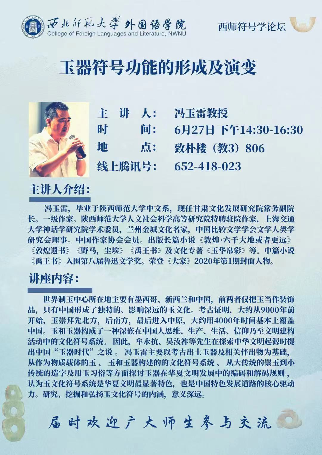 由甘肅文化發(fā)展研究院常務(wù)副院長、一級作家馮玉雷主講的《玉器符號功能的形成及演變》將于6月27日下午在西北師范大學(xué)舉辦。此項活動是西北師范大學(xué)外國語學(xué)院西師符號學(xué)論壇系列講座之一,旨在促進(jìn)玉文化與符號學(xué)的融合研究。
