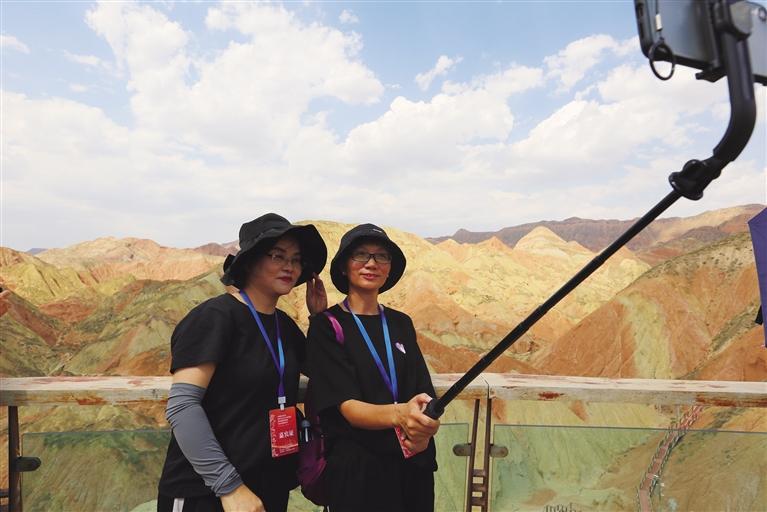 “這里綿延分布的彩色丘陵,好似與天際線融為了一體,勝似彩虹垂天。”王笑君是一名律師,平日里緊張忙碌的工作,總讓他不由自主有一種想逃離城市喧囂、回歸自然懷抱的愿望,機(jī)緣巧合之下他便選擇了水墨丹霞。他感慨地說(shuō):“真是挺難忘的,一眼望去,那五顏六色在陽(yáng)光下濃烈的交織在一起,好似一幅無(wú)邊無(wú)際的潑墨山水,美不勝收。”