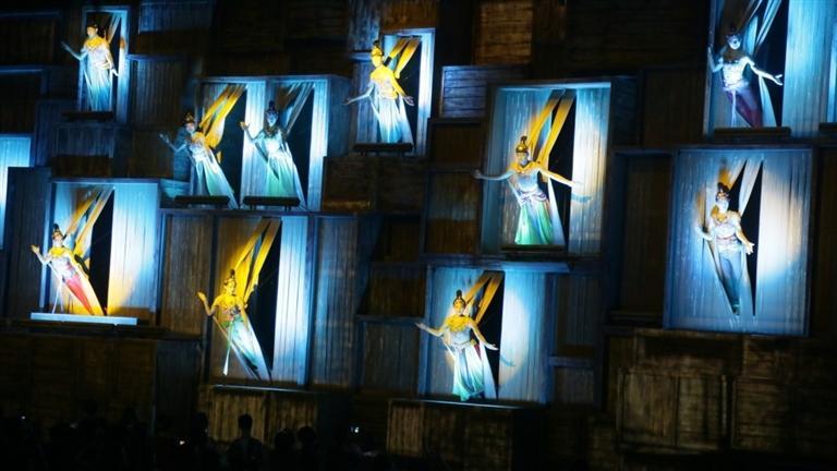 《敦煌盛典》徹底顛覆了傳統(tǒng)劇場(chǎng)舞臺(tái)表演模式和觀看形式,以鳴沙山為舞臺(tái)背景,真山真水,同時(shí),裸眼3D墻體投影、互動(dòng)包裹式劇場(chǎng)、多介質(zhì)水面造影、綜合機(jī)械演出、震撼墻體燈光秀、激光秀等“黑科技”也融入其中,獨(dú)創(chuàng)360度旋轉(zhuǎn)并前后移動(dòng)觀眾席,讓游客邊旋轉(zhuǎn)邊體驗(yàn),這在國(guó)內(nèi)旅游演藝中尚屬首創(chuàng)。