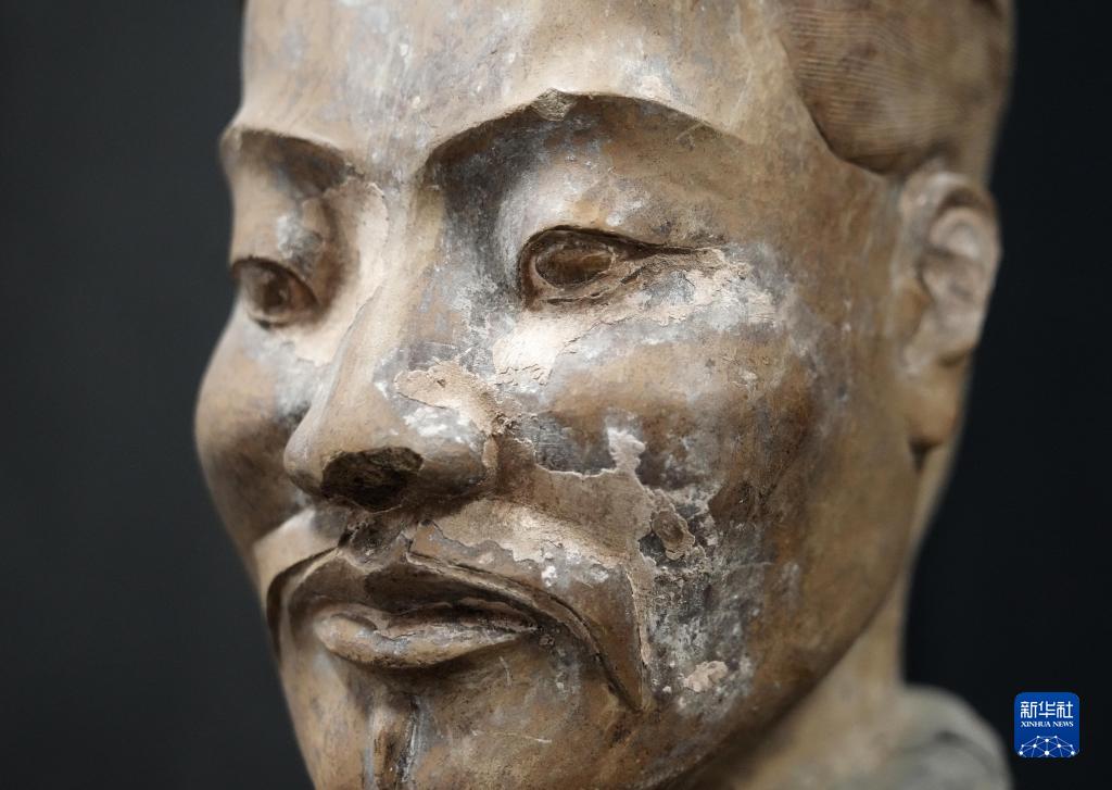 在秦始皇帝陵博物院文物保護(hù)部彩色陶俑修復(fù)室內(nèi),一尊秦俑臉部尚存部分彩繪層。秦俑五官的精準(zhǔn)塑造顯示出秦代匠人具有高超的寫實(shí)能力(8月23日攝)。