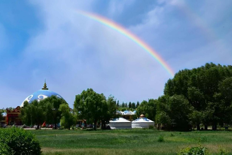 余每遙望心儀卻不能至的彩虹,常憶陸游《秋思》詩句:“天際掛虹初斷雨,云頭翳日又成陰。”秋游包頭賽汗塔拉(1),卻出人意料地邂逅可望亦可即的彩虹。經(jīng)當(dāng)?shù)赜讶艘I(lǐng)乘興疾步入彩虹落腳處,大異既往定見,歸作以志其趣。