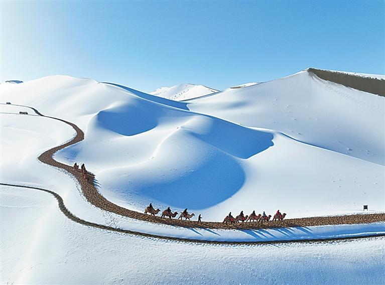 受冷空氣影響,11月14日晚,敦煌市迎來入冬以來的首場降雪。雪后的鳴沙山月牙泉景區(qū)銀裝素裹,景色如畫。游客踏雪而來,拍照打卡,感受大漠里難得一遇的雪后美景。