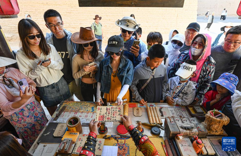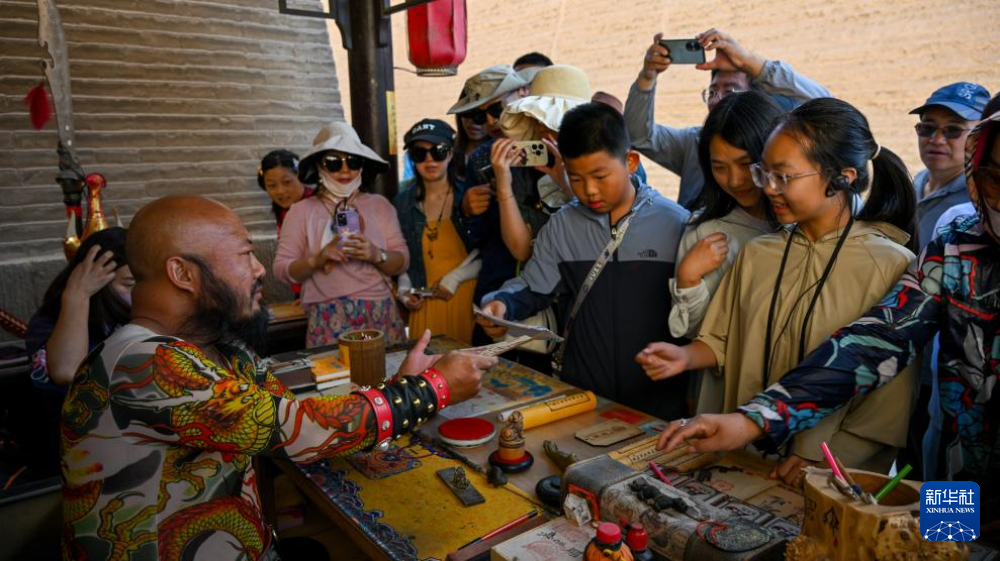 7月14日,在甘肅嘉峪關關城景區(qū),游客在李森的攤位前等待他“簽發(fā)關照”。新華社記者 陳鐘昊 攝