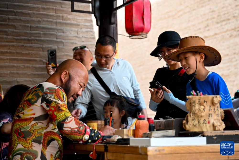 7月13日,在甘肅嘉峪關關城景區(qū),李森為游客手寫文創(chuàng)產(chǎn)品“關照”。新華社記者 劉金海 攝