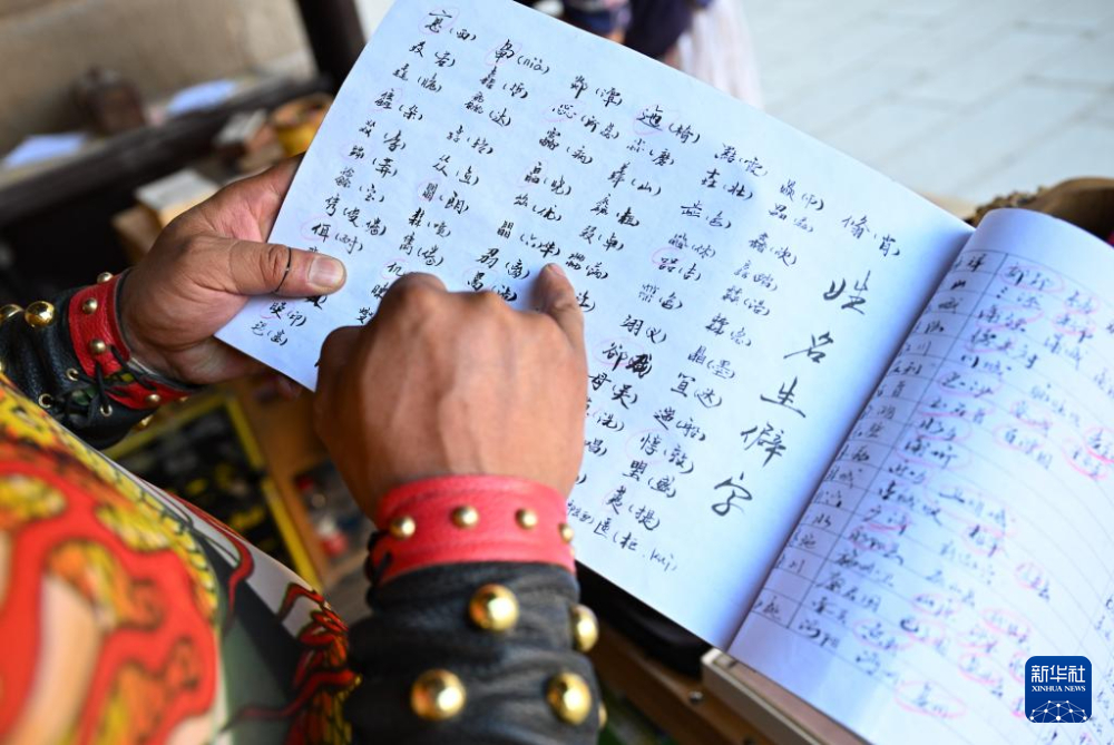 在甘肅嘉峪關關城景區(qū),李森在攤位上查閱自己編寫的含有生僻字讀音、城市古地名等內容的小冊子(7月14日攝)。新華社記者 陳鐘昊 攝