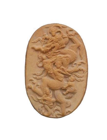 1990年出土于莊浪縣水洛鎮(zhèn)寺坪塬遺址。高11.7厘米,寬7.9厘米,厚1.5厘米,呈橢圓形。泥質紅陶,背面平素。畫面表現的是某神話故事,正面飾淺浮雕紋飾,正中為一巨龍張牙舞爪、怒目圓睜、奮力騰空,一女神左手緊抓龍角,右手持劍欲砍龍首;龍頸部有一女神拿繩索套縛,另一女神在龍胸部作拔劍狀;一力士則用力拽龍尾,凸目張嘴,聲色驚恐萬分;在龍的后肢旁還有一女神右手握劍砍殺。五神皆神態(tài)各異,造型逼真,生動表現了五神伏龍時驚心動魄的場景。