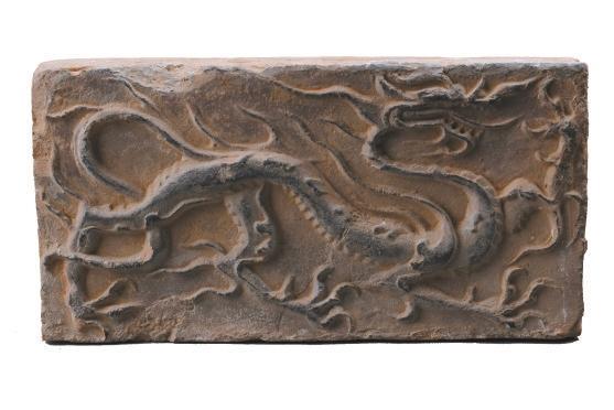 磚面上龍的形象棱角分明,骨架清瘦。龍身前屈后伸,起伏轉折,龍首高昂,張口吟嘯。前肢呈登騰狀,后肢做行進狀。鬣鬃飛揚,揚爪攪尾,四爪如鷙,整條龍動態(tài)十足,形象逼真,為五代時期模印花磚中的精品。
