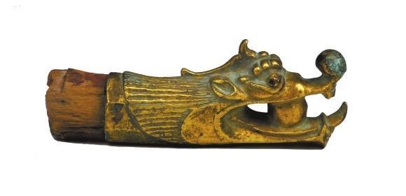 肅南裕固族自治縣馬蹄鄉(xiāng)二夾皮村出土。長19.3厘米,銅質,鎏金。形狀為龍頭,頸部中空,龍頭部分為獨角,龍眼暴睜,上唇卷起,口內含有一圓球。頸部龍發(fā)呈條形狀。
