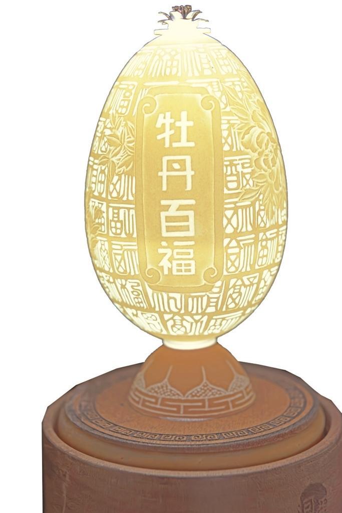 楊星國(guó)雕刻過的作品達(dá)兩千多件,作品《牡丹亭》是他用最新的拼雕手法創(chuàng)作的,鴕鳥蛋殼細(xì)分成300片,打磨成“瓦片”樣,逐片貼成古建筑中亭頂蓋狀,形成牡丹亭之樣,做成外層的“亭”;內(nèi)層的“牡丹”則用鴯鹋蛋殼,利用其自然色,依照牡丹層層雕透,第一層深墨、第二層墨綠、第三層淡綠、第四層白色從外到內(nèi)雕刻,作品既有國(guó)畫的神韻又有雕刻的立體藝術(shù)之美。浮雕、陰雕、陽雕、鏤空雕、拼雕等手法,在《牡丹亭》作品里全部顯現(xiàn)。為了讓作品表達(dá)的效果更充分,楊星國(guó)又加了一些機(jī)械原理讓其旋轉(zhuǎn),還加了燈光,于是,3個(gè)鴕鳥蛋殼與1個(gè)鴯鹋蛋殼在楊星國(guó)的巧妙構(gòu)思中有了全新的生命。