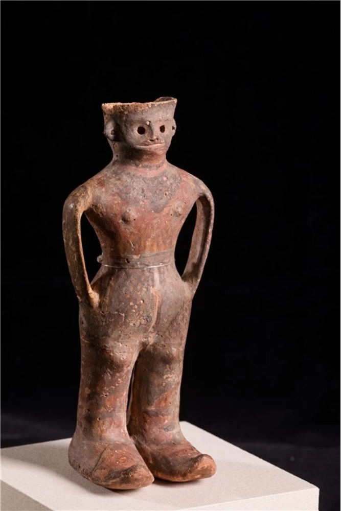 “河西少年”——人形彩陶罐出土于火燒溝遺址,國家一級珍貴文物, 1990年作為甘肅省選送的8件精品文物之一在舉辦第十一屆北京亞運(yùn)會期間向中外游客展出。遠(yuǎn)看是一名雙手插兜站立的酷少年,其體 態(tài)、動作和神情刻畫得栩栩如生;走近一看,人像短發(fā)、高鼻深目、雙耳開孔、表情生動,其身 著短上衣,頸部至胸前的網(wǎng)格紋就像是戴有精美的項(xiàng)飾,下身著網(wǎng)格長褲裙,雙手插在褲兜里, 碩大的雙腳上穿著肥大的高腰靴子,一副怡然自得的樣子。陶罐人體中空,可以盛水, 插入褲兜的雙臂形成陶罐的雙耳,設(shè)計(jì)大膽,制作精巧。2023年玉門市博物館參加的騰訊探元文化創(chuàng)新大賽“古物換新樣”中,“河西少年”成為追捧的對象,在眾多參賽作品中脫穎而出,被很多設(shè)計(jì)師設(shè)計(jì)成了背包、花盆、臺燈、盲盒等文創(chuàng)產(chǎn)品。