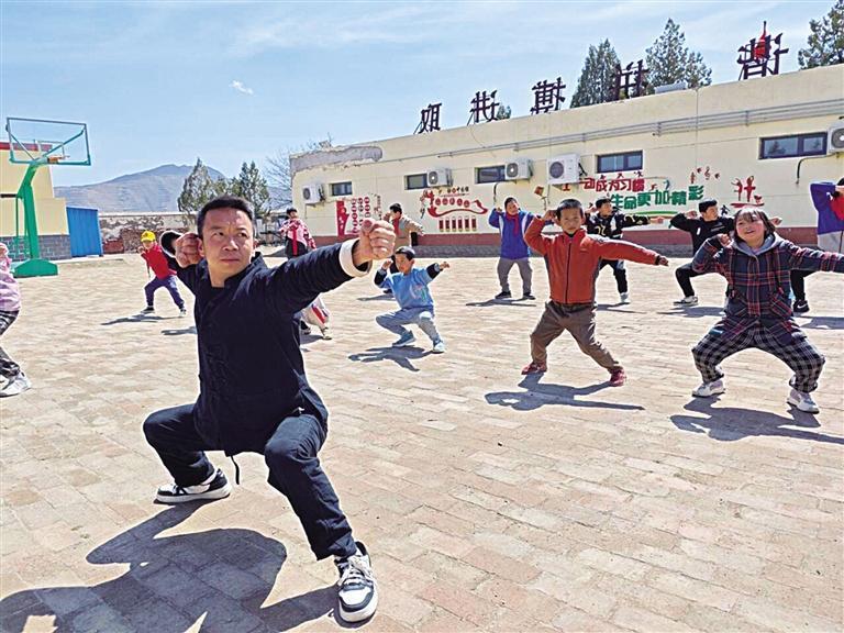 在晏家洼小學(xué),記者看到,山頂?shù)年柟馀c風(fēng)里,17個(gè)孩子整整齊齊地站在操場(chǎng)上,在陳偉禮的帶領(lǐng)下,有模有樣地練起來。弓步,出拳,眼神凌厲,撤腿,下蹲,身體下壓,此刻的孩子們像一只只努力展翅的雛鷹。
