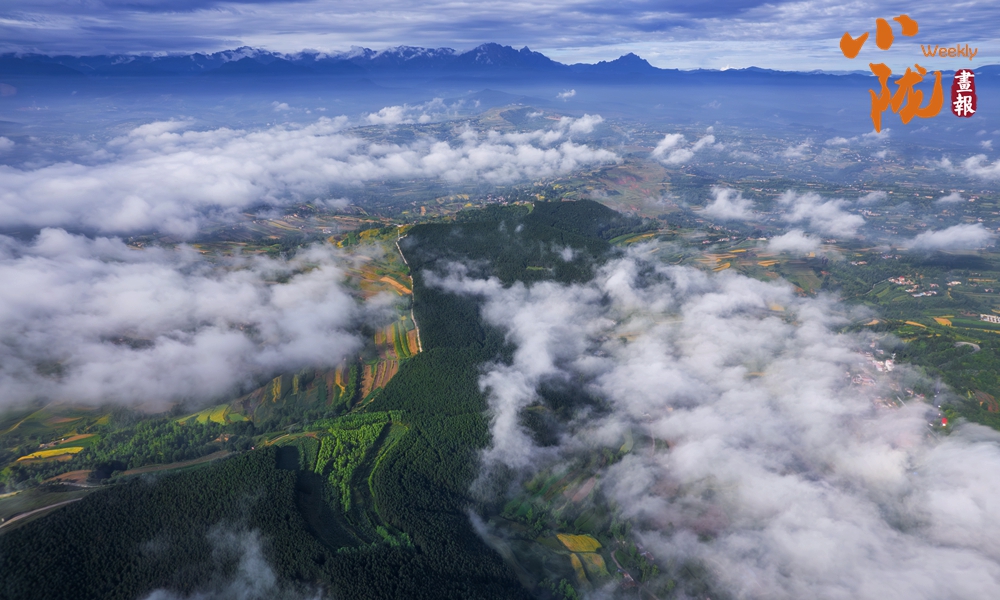 從高處俯瞰,白色的云海在大地上空翻騰涌動,時而聚攏,時而消散,田園、村莊在云霧中時隱時現(xiàn),如夢如幻。