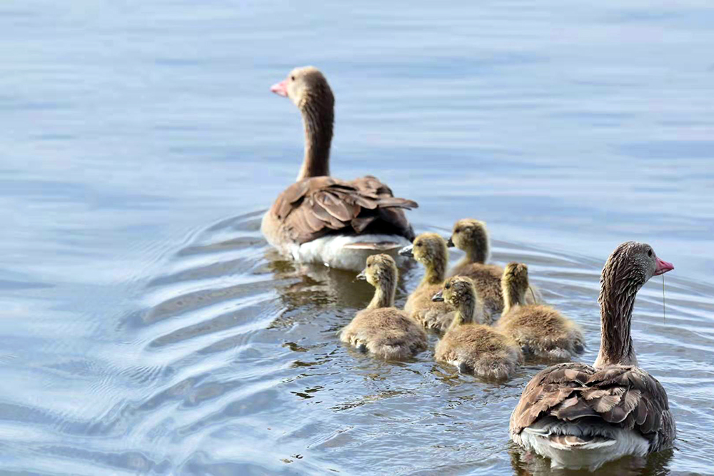 灰雁是鴨科雁屬鳥類,屬國家重點(diǎn)保護(hù)的“三有”鳥類,也是陽關(guān)濕地的夏候鳥。監(jiān)測(cè)顯示,在陽關(guān)濕地繁殖的灰雁家族有100多只。每年3月下旬遷飛至陽關(guān)濕地,4月中旬筑巢繁殖,5月上旬孵化出雛鳥4至5只。灰雁為“一夫一妻”制,孵化由雌鳥單獨(dú)承擔(dān),雄鳥在巢附近負(fù)責(zé)警戒。待雛鳥破殼出窩后,則由雌雄共同撫育。灰雁生性膽小、機(jī)警,小寶寶溜達(dá)時(shí),雌鳥在前開道,雄鳥負(fù)責(zé)斷后,小寶寶上岸覓食嫩草芽時(shí),雄鳥仍然負(fù)責(zé)警戒,若有危險(xiǎn)立刻鳴叫警示。故而,近距離拍攝灰雁雛鳥是比較困難的。