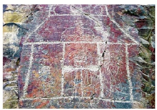 黑山巖畫中的晚期巖畫,主要反映宗教文化。紅柳溝、石關峽口巖畫中的殿堂、佛塔、佛像、古藏文題刻,可能屬于唐代中期以后的宗教遺物。藏傳佛教在 7世紀時同古藏文一起為吐蕃松贊干布創(chuàng)立。據(jù)史書記載,唐因平定“安史之亂”,河西空虛,吐蕃乘機占領河隴之地達 100 余年。吐蕃人居住河西,在紅柳溝、石關峽刻畫佛教殿堂、菩薩、佛像、佛塔是完全可能的。由此推斷,黑山紅柳溝、石關峽口佛塔、佛像及藏文題刻為唐中期以后的吐蕃所留。