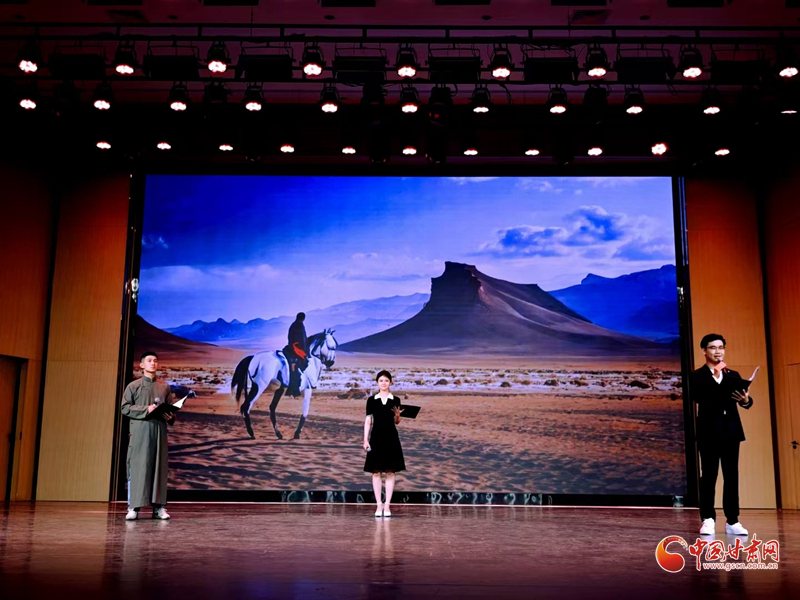 詩朗誦環(huán)節(jié)選取了著名詩人昌耀的《在敦煌名勝地聽駝鈴尋唐夢》、葉舟的《大唐西域記》、汪小平的《蘭州、別樣的城市》以及項目主持人徐兆壽的《尋找昆侖》《敦煌之光》等。這些作品都取材自絲綢之路,學(xué)員們以詩歌朗誦的形式,抒發(fā)了詩人對絲綢之路的贊美之情,展現(xiàn)了絲綢之路的壯麗景色和豐厚的歷史文化內(nèi)涵,仿佛令人置身于充滿傳奇色彩的古道。最后,全體學(xué)員與舞蹈演員合唱歌曲《等你在涼州》,將演出推向了高潮。