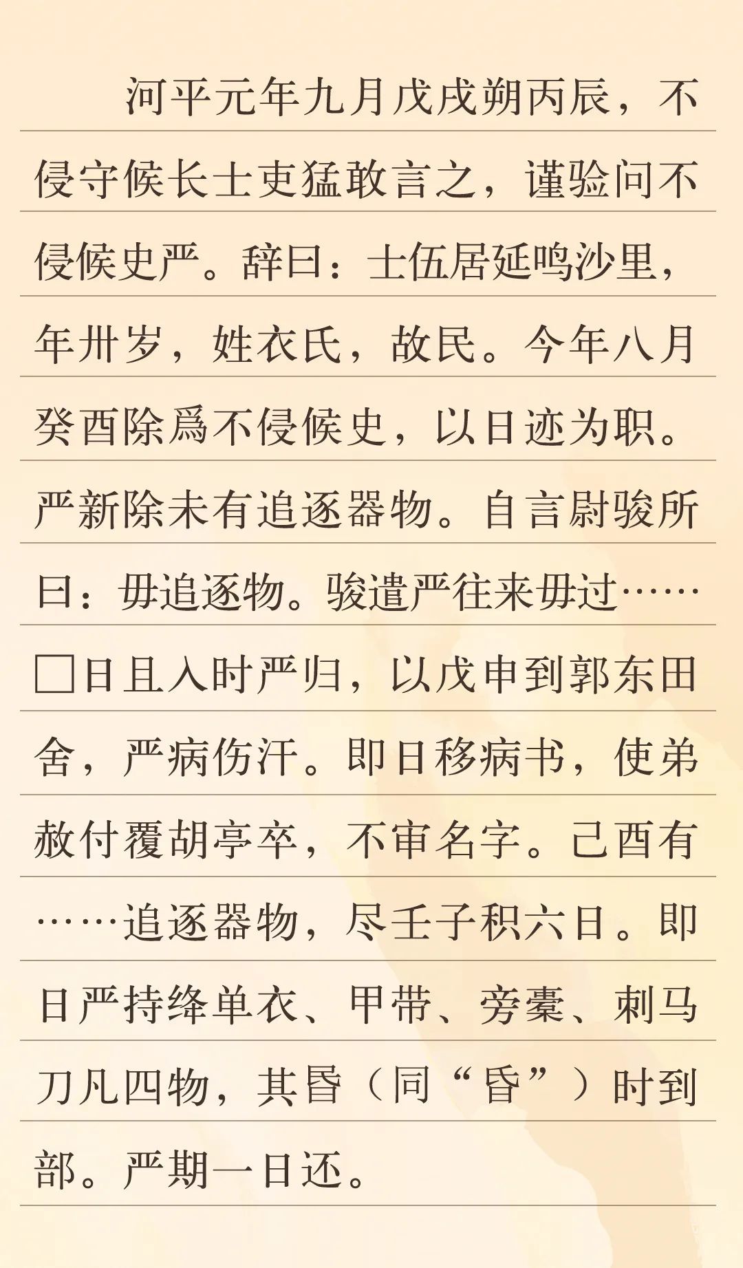 從行文方向上講,為公元前28年11月3日甲渠候官不侵部士吏孫猛向上級(jí)匯報(bào)的上行文書。主要記載了居延縣鳴沙里男子衣嚴(yán)初次擔(dān)任不侵部候史一職時(shí),未配備追捕逃亡人員必備的器具,于是他前往塞尉駿的治所詢問(wèn),在返回途中偶感風(fēng)寒,直到10月30日傍晚時(shí)分,才帶著刺馬刀等武器返回不侵候部,超出了約定期限。
