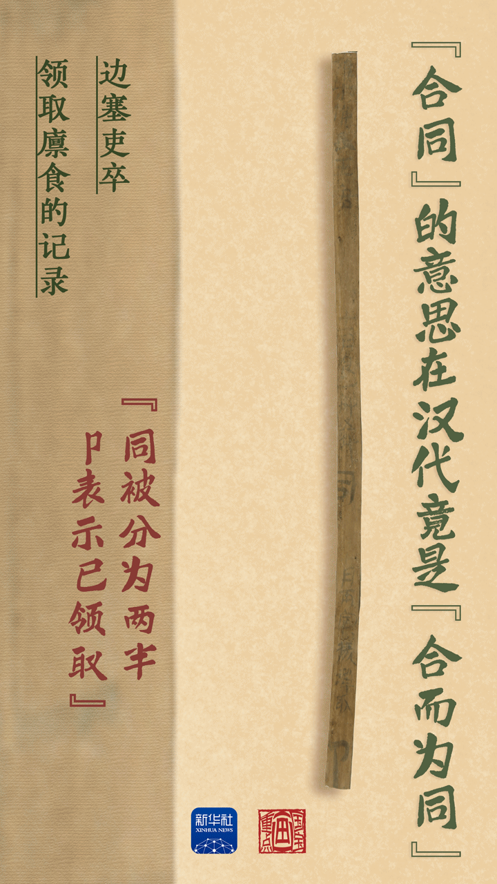 漢代人在簡(jiǎn)牘上書(shū)寫(xiě)一個(gè)“同”字,從中間一分為二,由雙方當(dāng)事人各執(zhí)一半。需要核驗(yàn)時(shí),雙方將所執(zhí)半簡(jiǎn)合在一起,這樣就能拼成一個(gè)完整的“同”字。或許,這就是現(xiàn)代“合同”的來(lái)歷。