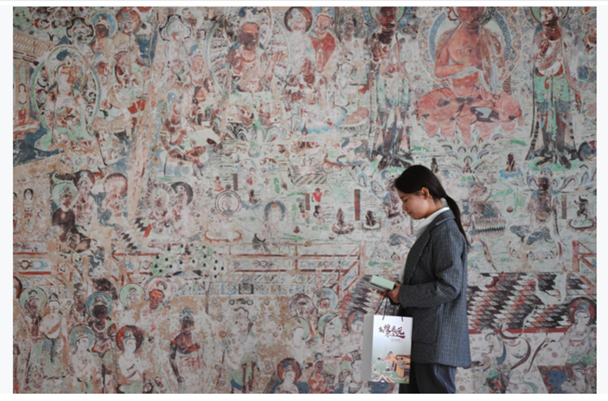 圖為敦煌研究院文物數(shù)字化保護(hù)團(tuán)隊(duì)創(chuàng)意營(yíng)銷人員廖雪婷從一幅高保真復(fù)制壁畫(huà)前走過(guò)(2023年4月25日攝)。新華社記者陳斌攝