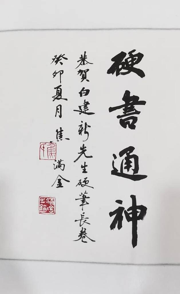 甘肅省硬筆書法家協(xié)會(huì)主席焦?jié)M金先生為該長卷題詞:硬書通神