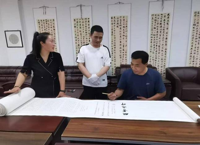甘肅省硬筆書法家協(xié)會(huì)主席焦?jié)M金(右一)為長卷題詞