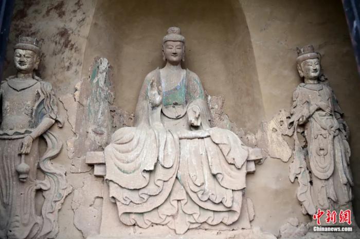 麥積山石窟第44窟的西魏泥塑一佛二菩薩組像。主尊佛像被譽為“東方美人”。九美旦增 攝