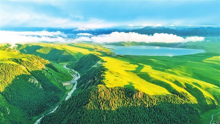 白雪皚皚的祁連山下,一眼望不到邊的大片牧草青翠碧綠,色彩斑斕的野花競(jìng)相開放,擁有百萬畝草原的山丹馬場(chǎng)如巨幅彩色畫卷徐徐展開。
